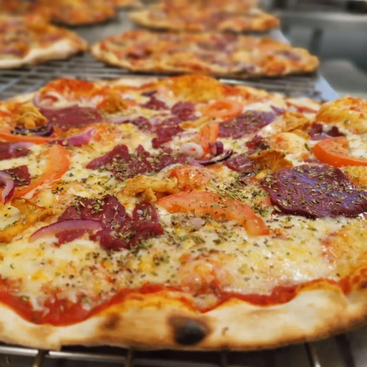 Våra pizzor tillverkas i eget bageri, pizzorna toppas med våra egna råvaror och gräddas i en vedeldad stenugn.